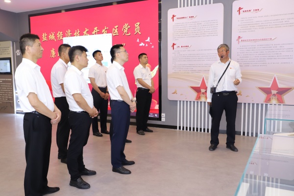 在五條嶺烈士陵園內,全體黨員同志莊嚴佇立,向革命先烈敬獻花籃,大家面對黨旗莊嚴宣誓,銘記歷史,感悟不朽的革命精神。陳列館內,五條嶺烈士陵園第三代守墓人卞康全同志為大家詳細講解了鹽南阻擊戰、五條嶺烈士安葬等事跡,結合“從爭取和平到保衛邊區”“從堅持斗爭到反攻作戰”“從全境解放到全國解放”“難忘五條嶺”展廳形象地介紹了鹽阜軍民攜手作戰的光輝歷史。