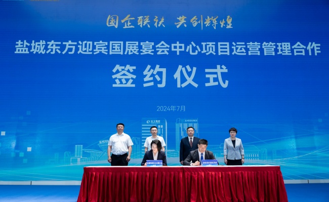 7月12日,鹽城東方集團與鹽城國投集團在鹽城國際會展中心A館,舉行鹽城東方迎賓國展宴會中心項目運營管理合作簽約儀式。鹽城東方集團黨委書記、董事長王旭東和鹽城國投集團黨委委員、副總經理,鹽城市迎賓館酒店集團黨委書記、董事長劉晉國出席簽約儀式并分別致辭。