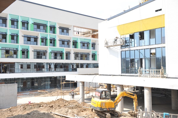 在北師大附屬學校幼兒園小學項目現場,k2、k3樓工人正在進行外墻柔性面磚施工,P3樓正在貼衛生間墻地磚,滾刷二遍乳膠漆,施工現場一片大干場景。據悉,目前施工現場共有14個施工隊伍正在進行交叉施工,該項目人員克服工期緊、任務重、隊伍多等困難,通過打足人馬、套搭施工、每日召開協調會、每晚加班施工等措施來推進項目進度,確保9月份順利開學的目標能按時實現。