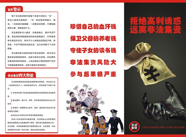 希望廣大人民群眾都能積極投身到防范和打擊非法集資的行為中來(lái),認(rèn)真學(xué)習(xí)和掌握非法集資的特征,做到“三看三思三不要”。切實(shí)認(rèn)清非法集資的本質(zhì)和危害,自覺(jué)增強(qiáng)防范意識(shí)、理性投資意識(shí),堅(jiān)信“天下沒(méi)有免費(fèi)的午餐”,切記“你惦記他的高額回報(bào),他惦記你投入的本金”,高收益往往伴隨著高風(fēng)險(xiǎn),自覺(jué)抵制各種誘惑,依法保護(hù)自身權(quán)益。對(duì)高額回報(bào)、快速致富的投資項(xiàng)目要冷靜分析、三思而后行,多向?qū)I(yè)機(jī)構(gòu)、專業(yè)人士咨詢;對(duì)不熟悉的理財(cái)項(xiàng)目或公司要多問(wèn)幾個(gè)“為什么”,究竟有沒(méi)有權(quán)威部門的批準(zhǔn),經(jīng)營(yíng)范圍有哪些,到底違不違反國(guó)家法律,決不輕信高額利息的許諾,真正做到珍惜辛苦錢、守好血汗錢,遠(yuǎn)離非法集資活動(dòng)。同時(shí),要增強(qiáng)風(fēng)險(xiǎn)自擔(dān)意識(shí),謹(jǐn)記參與非法集資造成的損失要自行承擔(dān)。