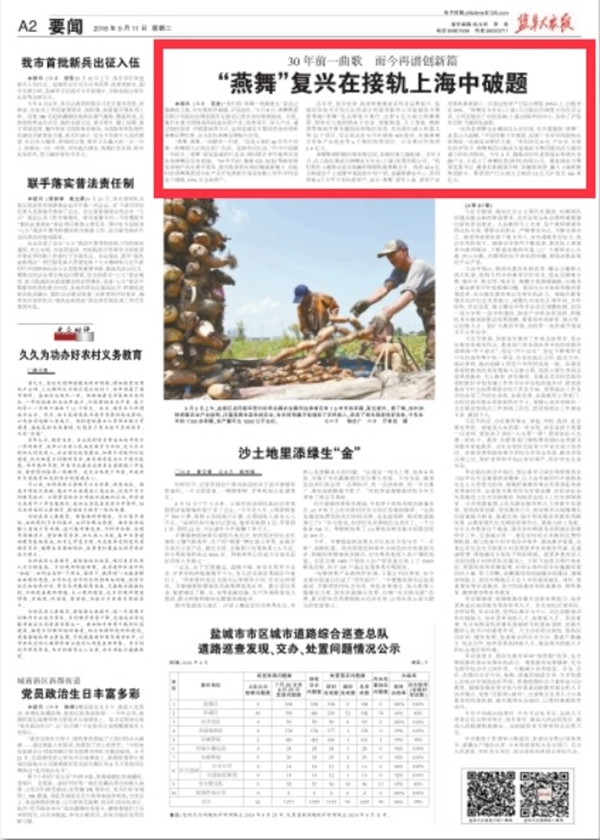 《鹽阜大眾報》今日二版頭條推出“30年前一曲歌 而今再譜創新篇——'燕舞'復興在接軌上海中破題” http://yfdzb.ycnews.cn/yfdz/20180911/html/page_01_content_003.htm(《鹽阜大眾報》電子版)——