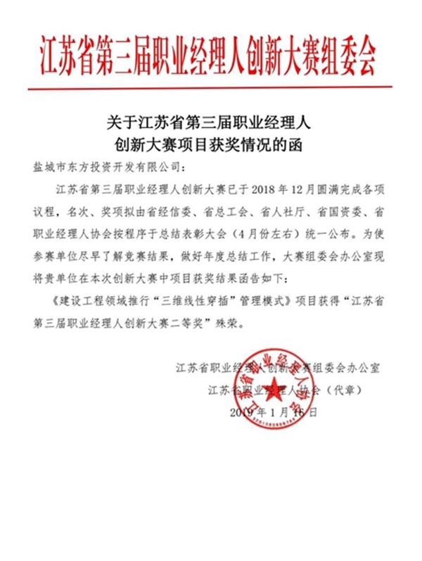 1月16日,從江蘇省第三屆職業經理人創新大賽組委會傳來喜訊,鹽城東方集團的參賽項目《建設工程領域推行“三維線性穿插”管理模式》獲得了本次賽事二等獎殊榮,這是對該集團苦干實干,奮力推進北師大鹽城附校建設的褒獎。