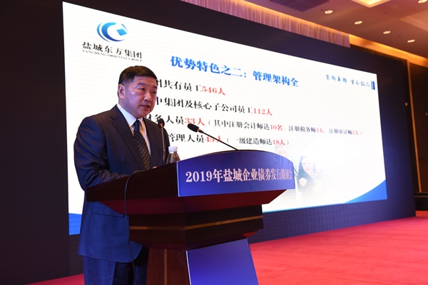3月6日,由鹽城市地方金融監(jiān)督管理局、中國(guó)人民銀行鹽城市中心支行主辦,興業(yè)銀行鹽城分行、江蘇悅達(dá)集團(tuán)承辦的2019年鹽城企業(yè)債券發(fā)行路演會(huì)舉行,全國(guó)42家知名券商、基金和投資機(jī)構(gòu)濟(jì)濟(jì)一堂。鹽城市副市長(zhǎng)孫軼出席活動(dòng)并致辭。鹽城東方集團(tuán)應(yīng)邀參加活動(dòng),并第一家做現(xiàn)場(chǎng)推介。