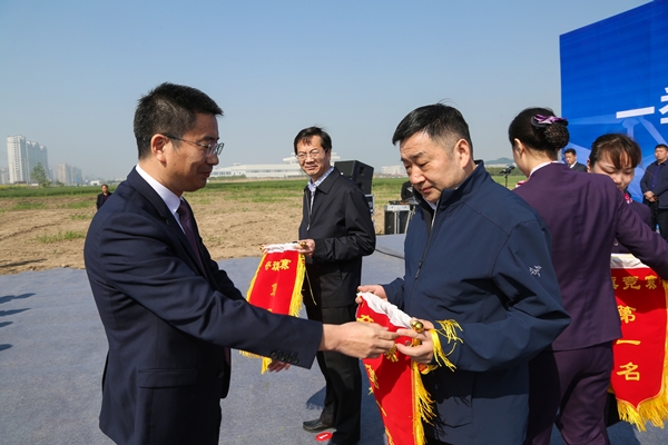 圖為區(qū)領(lǐng)導(dǎo)向東方集團(tuán)董事長(zhǎng)張振國(guó)授予全區(qū)分檔奪旗競(jìng)賽第一名的紅旗