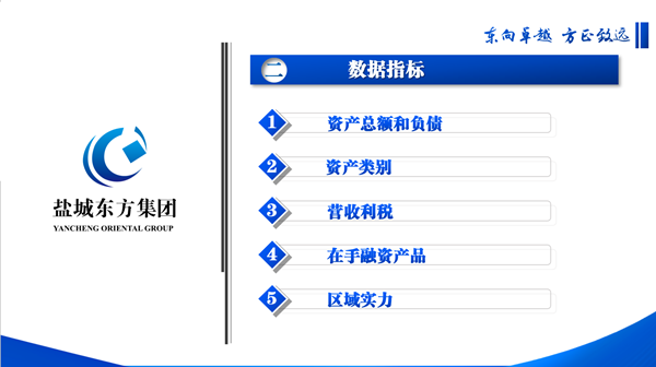 在現(xiàn)場推介階段,鹽城東方集團(tuán)黨委書記、董事長張振國結(jié)合PPT,從發(fā)展歷程、財(cái)務(wù)指標(biāo)、優(yōu)勢特色等角度圖文并茂地推介了集團(tuán)的發(fā)展亮點(diǎn),精彩呈現(xiàn)了東方集團(tuán)16年發(fā)展歷程中從小到大、由弱變強(qiáng)的企業(yè)蛻變,一串串有說服力的數(shù)據(jù)指標(biāo)、一個個優(yōu)質(zhì)的重點(diǎn)項(xiàng)目、一行行優(yōu)異的工作業(yè)績,組合成一張亮眼的“成績單”,見證了東方集團(tuán)初步實(shí)現(xiàn)“全市標(biāo)桿、蘇北領(lǐng)先、全省有位、上海有突破、全國有影響”的發(fā)展目標(biāo)。