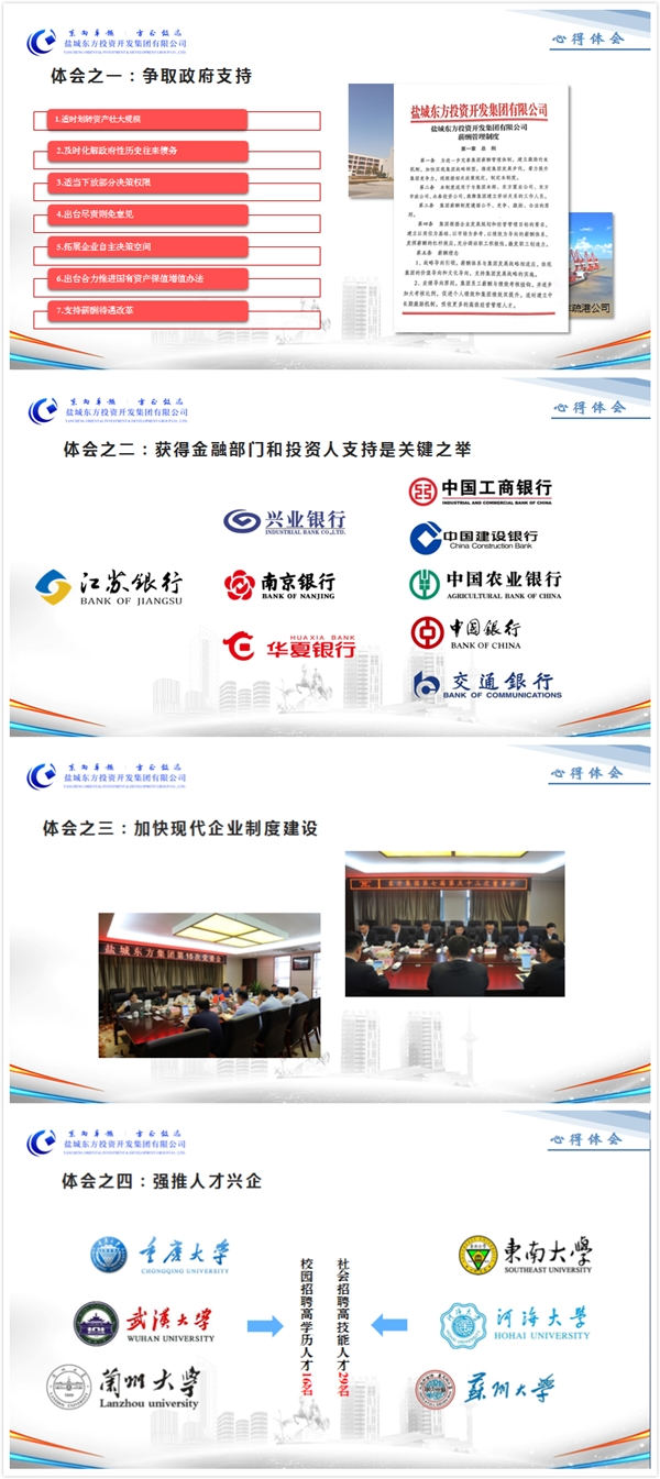 鹽城東方轉(zhuǎn)型發(fā)展除了內(nèi)生動(dòng)力得到充分激發(fā)、把準(zhǔn)了幾個(gè)重要機(jī)遇外,還得益于黨委、政府的堅(jiān)強(qiáng)領(lǐng)導(dǎo),更得益于和像江蘇銀行這樣的金融機(jī)構(gòu)的鼎力扶持。主要心得體會有:一是爭取政府支持是重要保障。二是獲得金融部門和投資人支持是關(guān)鍵之舉。三是加快現(xiàn)代企業(yè)制度建設(shè)是有力支撐。四是強(qiáng)推人才興企是轉(zhuǎn)型根本。