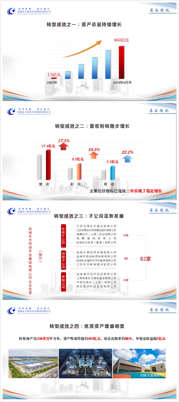 從基本情況來看,鹽城東方集團(tuán)經(jīng)過16年的發(fā)展,目前已從單純政府投融資平臺,向市場化、實(shí)體型、投資型、效益型、品牌型實(shí)業(yè)國有企業(yè)轉(zhuǎn)型。十多年來,鹽城東方集團(tuán)強(qiáng)推“六化”促轉(zhuǎn)型,謀求發(fā)展高質(zhì)量。即以穩(wěn)增長為導(dǎo)向、加快規(guī)模化擴(kuò)張,以走出去為動(dòng)能、提速外向化開拓,以調(diào)結(jié)構(gòu)為引擎、激活高效化混改,以主板塊為支撐、強(qiáng)推實(shí)體化運(yùn)行,以防風(fēng)險(xiǎn)為保障、加速規(guī)范化進(jìn)程,以創(chuàng)特色為方向、加快品牌化塑造,主要取得四個(gè)方面的轉(zhuǎn)型成效:一是資產(chǎn)總量持續(xù)增長。二是營收利稅穩(wěn)步增長。三是子公司較快發(fā)展。四是優(yōu)質(zhì)資產(chǎn)增值明顯。