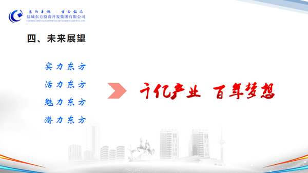 當(dāng)前,鹽城東方集團(tuán)所在的鹽城經(jīng)開區(qū),恰逢國務(wù)院和省、市政府全力支持推進(jìn)中韓(鹽城)產(chǎn)業(yè)園建設(shè)的黃金機(jī)遇,在“天時(shí)、地利、人和”的難得良機(jī)前,對于未來,東方集團(tuán)將堅(jiān)定不移地選擇主動(dòng)轉(zhuǎn)、穩(wěn)健轉(zhuǎn)、高效轉(zhuǎn),樹立打造“千億產(chǎn)業(yè)•百年夢想”美好愿景。