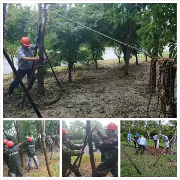 在上級領導的統籌安排下,東方園林公司對“一片林”及經開區內的綠化養護路段分四大巡查區域,對區域內的樹木進行加固。各部門嚴格執行汛期24小時專人值班制度,進行不間斷巡查,巡查期間及時排除道路險情4起,對倒伏樹木進行扶正,已累計扶正樹木500多棵。