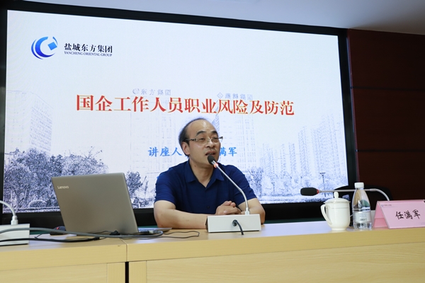 為進一步強化集團全體工作人員的風險防范意識, 8月22日下午,鹽城東方集團在1012會議室舉辦了《國企工作人員職業風險及防范》專題培訓講座。講座由集團副總經理吳將主持,培訓專程邀請到了市政府首席法律專家、鹽城師范學院法學副教授任滿軍授課。