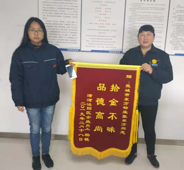 接過手機的失主連連道謝:“手機里有很多公司資料及個人重要信息,找不到不但會影響工作也會帶來很多麻煩。原本想,下了一天大雨,就是有人撿到,估計歸還的希望也不大,要不是你們,公司好多機密將可能被泄漏出去,我也將失去工作。東方物業員工真是當今社會的楷模”。失主當即拿出部分現金以表感謝,被物業工作人員謝絕,失主特意定做了一面“拾金不昧、品德高尚”的錦旗送至物業項目部以表感謝!