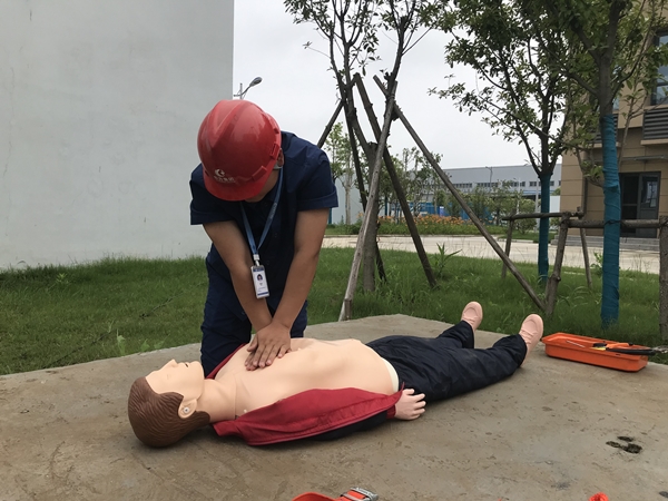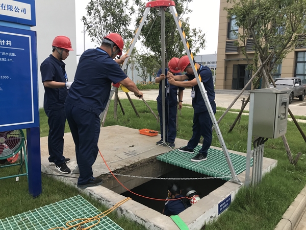 演練情景模擬時,該公司員工按正常審批流程進入進水流量計井作業(yè),因硫化氫中毒作業(yè)人員昏倒在井內,現場作業(yè)組將事故情況立即上報。現場總指揮王軍立即啟動預案,同時召集救援組趕赴現場進行搶救,地面救援組安置好救援三腳架并將救援繩放入井內,下井救援人員王權權佩戴正壓式空氣呼吸器等防護用品進入井內,給“受傷人員”系好救援繩并拉出井外,由地面救援組張成杰對傷者進行了心肺復蘇。經過半個小時緊張有序的演練,“傷員”得到有效救治,事故得到有效處置。