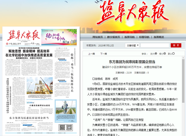2020年6月28日《新華日報》第4版:“一線視點”刊發(fā)《鹽城東方集團(tuán)展國企擔(dān)當(dāng),讓5萬余被征地群眾“安居”》。