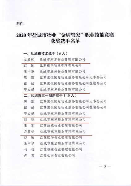 日前,鹽城市住建局、市人社局、市總工會(huì)聯(lián)合發(fā)布《2020年鹽城市物業(yè)“金牌管家”職業(yè)技能競(jìng)賽獲獎(jiǎng)選手名單的通知》,鹽城市東方物業(yè)管理有限公司3名選手榜上有名。其中,東方物業(yè)副總經(jīng)理左其杭、東方物業(yè)工程部設(shè)備維護(hù)員管文超兩人均獲得“鹽城市技術(shù)能手”“鹽城市五一創(chuàng)新能手”稱(chēng)號(hào),東方物業(yè)工程部工程維修管理員顏錢(qián)獲得“鹽城市五一創(chuàng)新能手”稱(chēng)號(hào)。