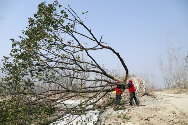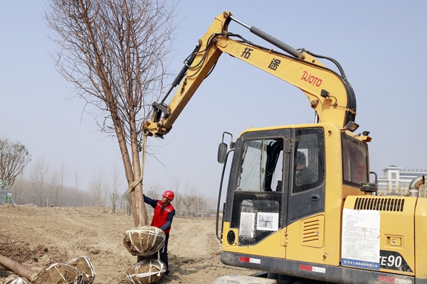 正月十二,通榆河岸邊的垂柳迫不及待地吐露新芽,鮮綠的枝條在風中起舞,展示著春天的生機。在鹽城新四軍文化林施工現場,鹽城東方園林工程有限公司承擔的通榆河東側生態苗圃工程火熱推進中。