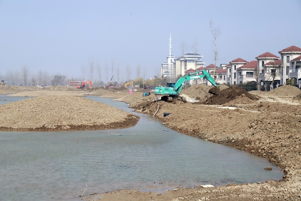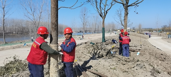 2月23日,鹽城經濟技術開發區新都路南側、通榆河東側,在通往鹽瀆路北、天山路西側的地塊中,都有星星點點的穿著東方園林熒光橙色背心勞作的身影??傞L1.33千米的作業線上,工作人員正在指揮吊車,將落羽杉移到指定的種植點;現場地形平整、河道開挖初步成型,已卸車的喬木整齊碼放在一起;工人們忙著為待栽植的樹木修剪樹枝,用藤條綁扎樹干根部。據項目現場負責人孫龍介紹,該項目需要栽植各類樹木約4700棵,計劃3月25完成?,F場近180人開工,同時配備2輛吊車、6臺挖機、1輛水車全天候用于場地平整、裝卸樹木和澆灌苗木。截至目前,東方團林施工團隊已經栽植樹木500多棵,包含香樟、廣玉蘭、櫸樹、銀杏、落羽杉等品種。