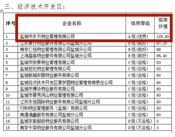 日前,鹽城市住建局發布《關于公布2020年度物業服務企業信用等級和紅黑榜名單的通知》,公示鹽城市2020年度物業服務企業信用綜合評價結果。全市共有589家物業服務企業參加評定,鹽城市東方物業管理有限公司以125.8分的優異成績順利通過鹽城市物業服務行業綜合監管平臺測評,獲得鹽城市2020年度物業服務企業信用等級A級認證,并榮登鹽城市2020年度物業服務企業紅榜榜首。
