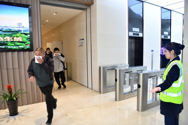 隨著大樓內消防警鈴和廣播聲的響起,集團各樓層人員在現場疏散人員的指揮下,沿電梯廳前室處疏散樓梯撤離到室外廣場集中,由各部門負責人清點人員并上報總指揮。