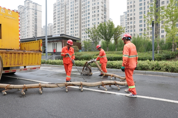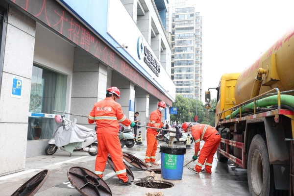 在建行開發(fā)區(qū)支行門口,一群身著橙紅工裝、頭戴安全帽的工人師傅,正在濕潤的路面上開啟井蓋,細(xì)致清掏淤積的油污雜物,黑色垃圾袋很快被殘渣填滿……地面水跡反光映出他們彎腰忙碌的身影,遠(yuǎn)處高樓的寧靜與近處器械的轟鳴形成了鮮明對比。