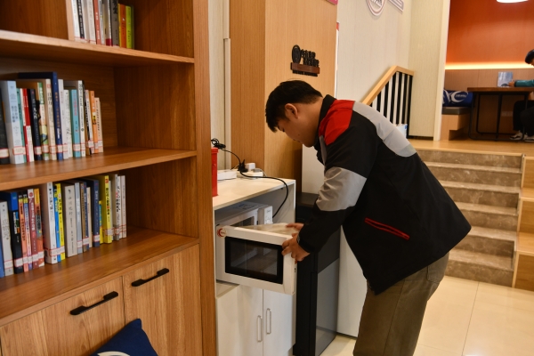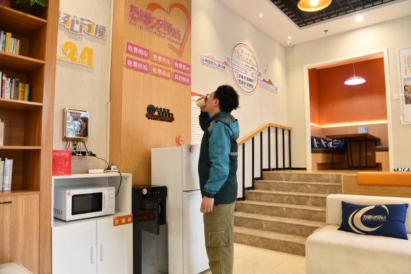 走進驛站,桌椅、飲水機、微波爐、空調等設備一應俱全,還配有應急雨具、醫藥箱、充電設備和免費的Wi-Fi。新就業群體常遇到的吃飯難、喝水難、休息難、充電難等問題,在這里都能得到解決。